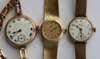 circular gilt dial signed Omega, flexible milanese bracelet, together with two early 20th century gold cased wrist watches, one with expanding bracelet