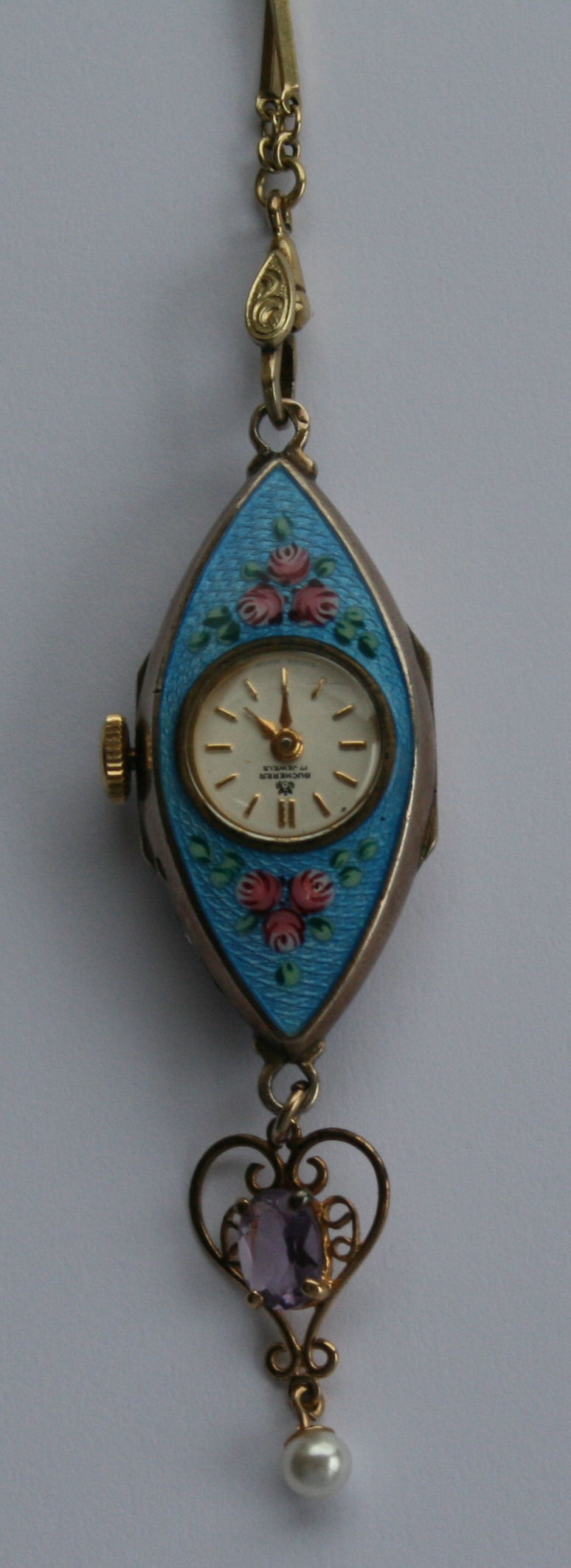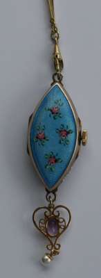 the navette shaped case with guilloche and floral enamel decorated front and back, the circular champagne dial inscribed Bucherer, the watch with an amethyst and pearl set drop pendant, all on a yellow metal long neck chain of long square section rectangular bar links, (chain marked 585)