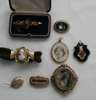 to include; a citrine brooch in a box, gold and pearl scrolling frame; a pietra dura brooch; three mourning brooches; a hair and gilt metal mounted bracelet with carved shell cameo; a locket and a pendant with double sided photograph