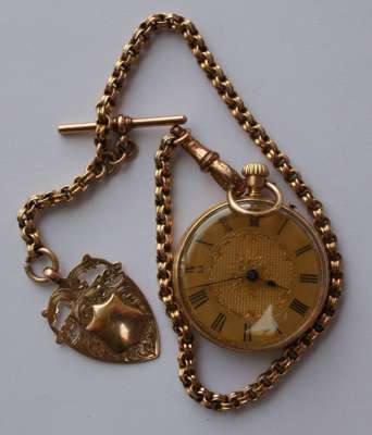 engine turned outer case, gilt dial, lever movement, together with a ribbed circular link Albert with T bar and 9ct gold medal