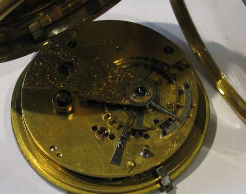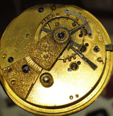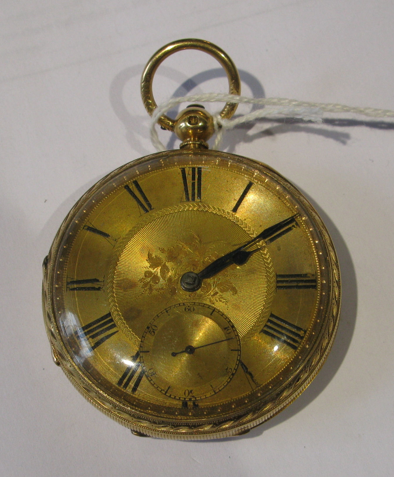 the key wind fusee movement in an engraved open faced case, with floral decorated gilt dial