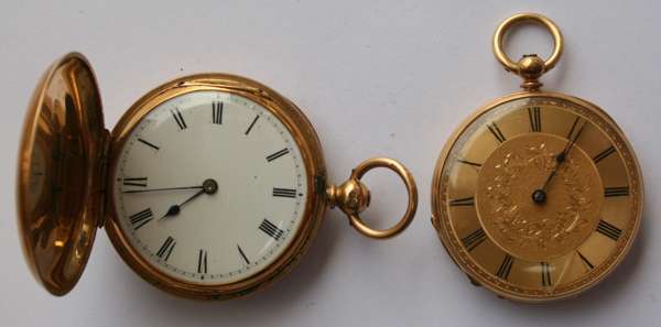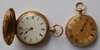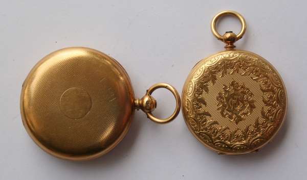 in full hunting cases, engine turned decoration, lever movement, together with an 18K open faced key wind fob watch, gilt dial, foliate decorated rear cover