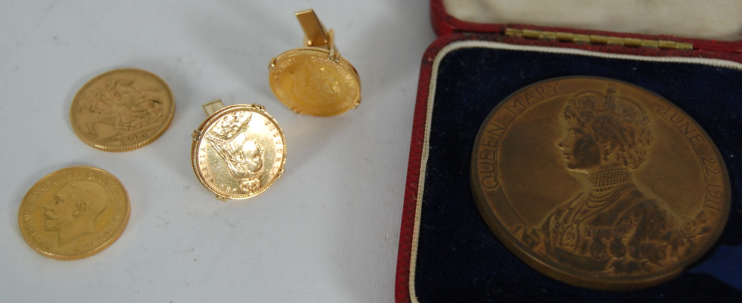 To include a 1904 sovereign; 1911 sovereign; a pair of Victorian half sovereign mounted cufflinks, in 14k mounts and a 1911 bronze coronation medallion (5)