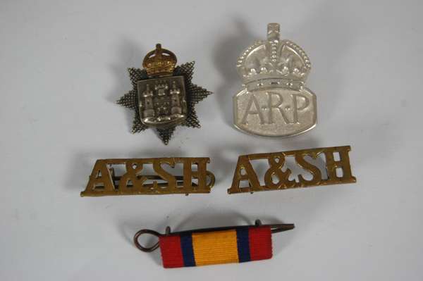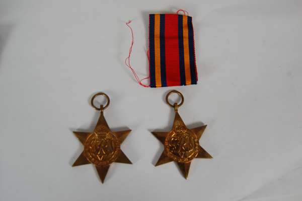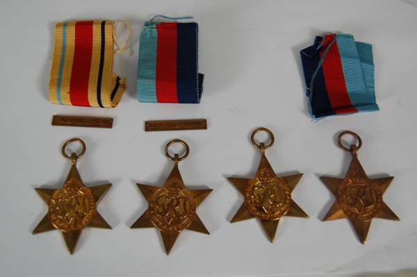 to include, Air Crew Europe, three 1939 - 45 stars; Burma Star; Atlantic Star; Africa Star; Pacific Star; loose France & Germany and North Africa bars; and two War Medals; together with three card boxes of issue and various shoulder titles and badges etc (qty)