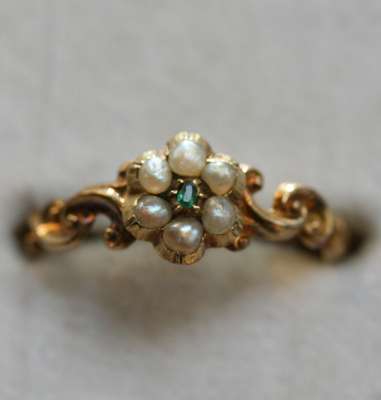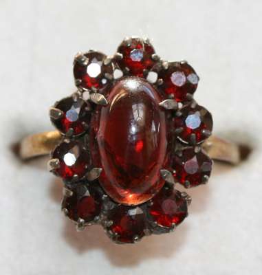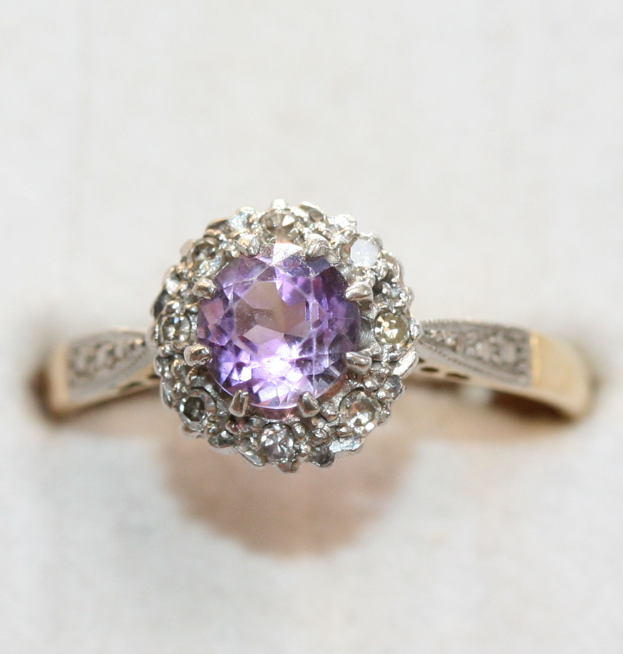 an amethyst ring with a pave set border of diamonds and similarly set shoulders; an 18ct gold ring set rounded rectangular garnet, split shoulders; a garnet cluster ring; a delicate pearl and gem set ring, scrolling shoulders (4)