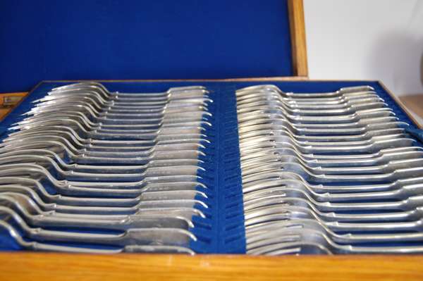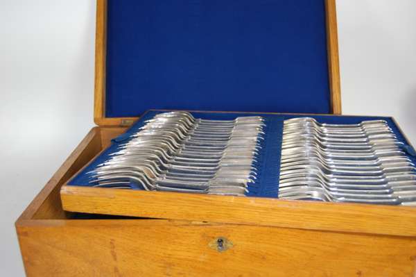 contained in oak canteen with lift out tray, comprising twenty four of each, tablespoon, dessert spoon, table fork and dessert fork