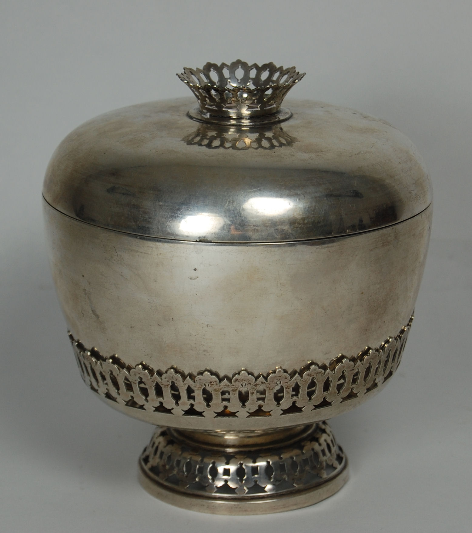 with character mark to bowl and stand, the deep bowl of simple form with pull off cover with pierced finial, resting in a dished stand with pierced border and similar pierced domed foot