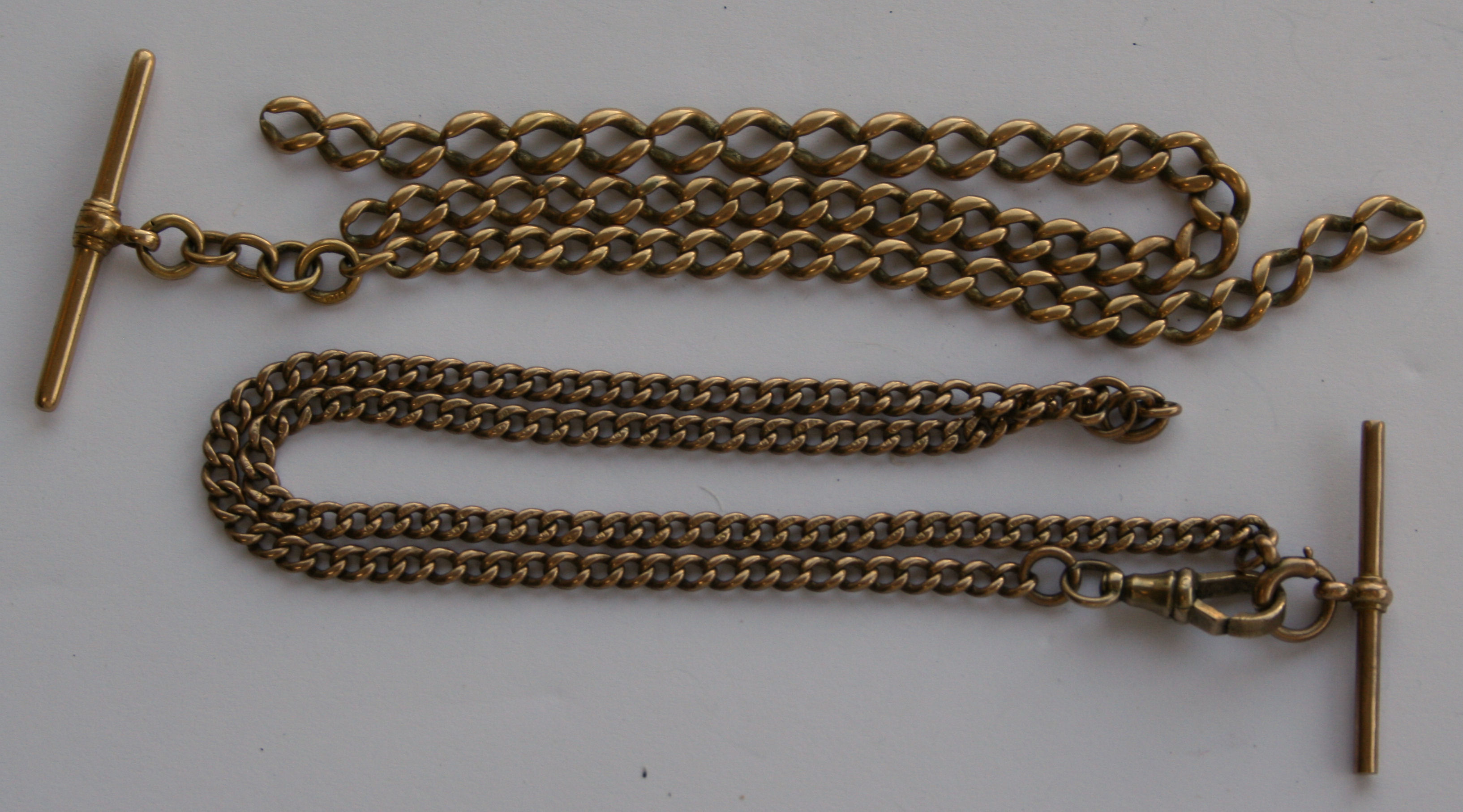 with T-bar suspension; a section of an 18ct gold curb link Albert chain, also with T-bar suspension; together with a graduated curb link chain (3)