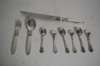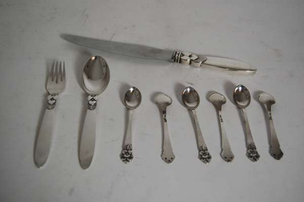 with London import marks 1936 and 1937, comprising a table knife, dessert spoon and dessert fork; together with a set of six coffee spoons with flower head terminals marked 830S, TNM (9)