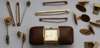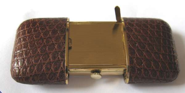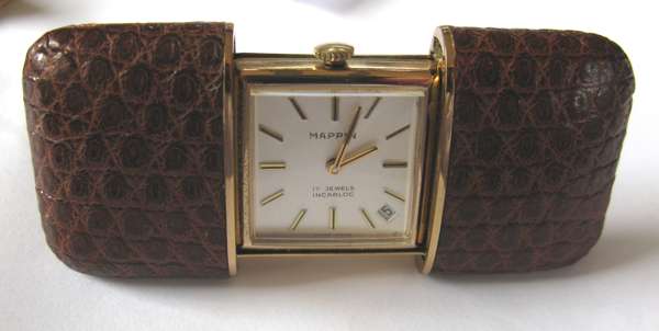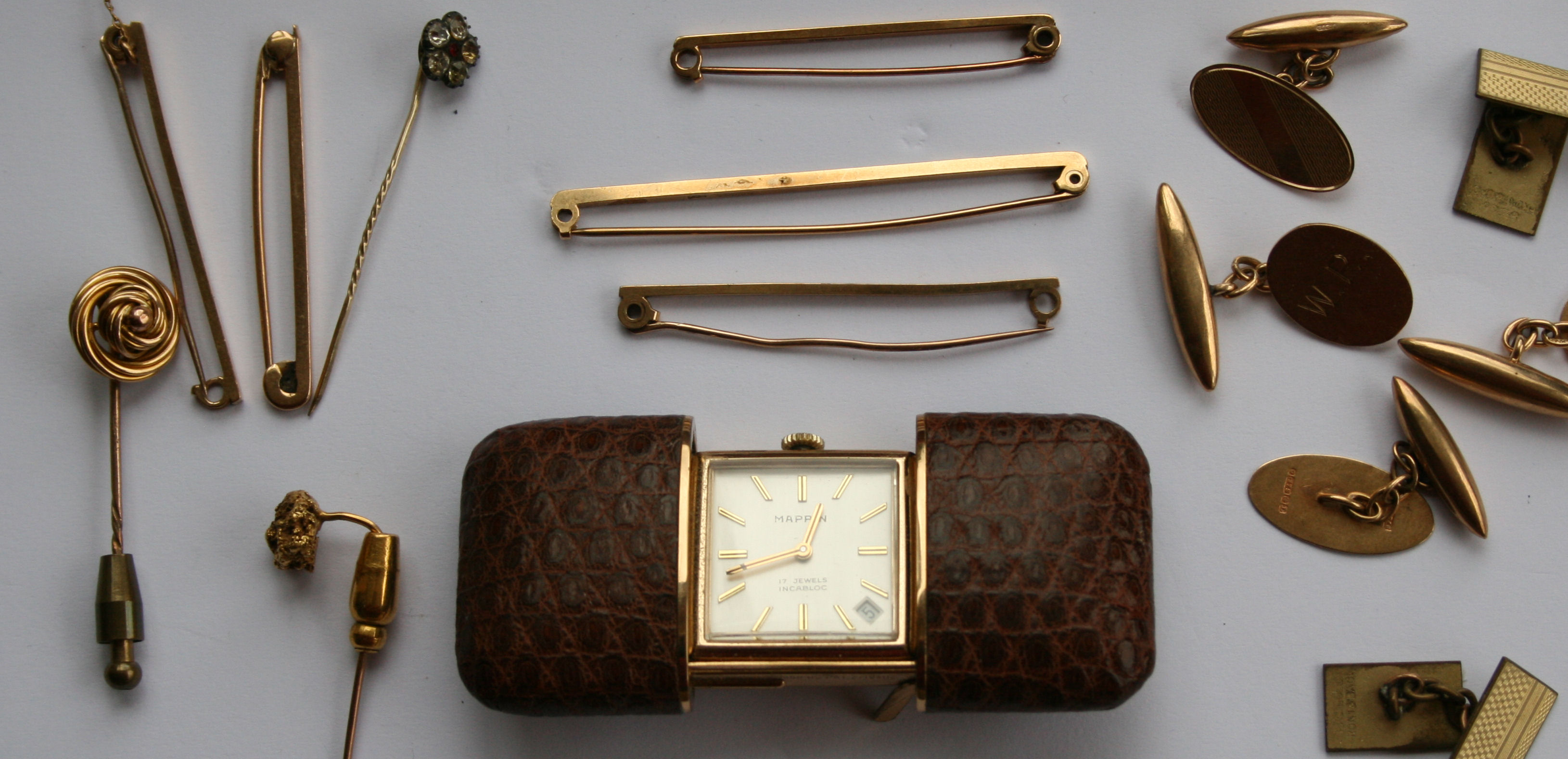 five gold tie bars, a gold nugget tie pin; a gold knot tie pin; a paste set tie pin; two pairs of cufflinks; a leather cased travel watch in the Movado style, by Mappin with date aperture