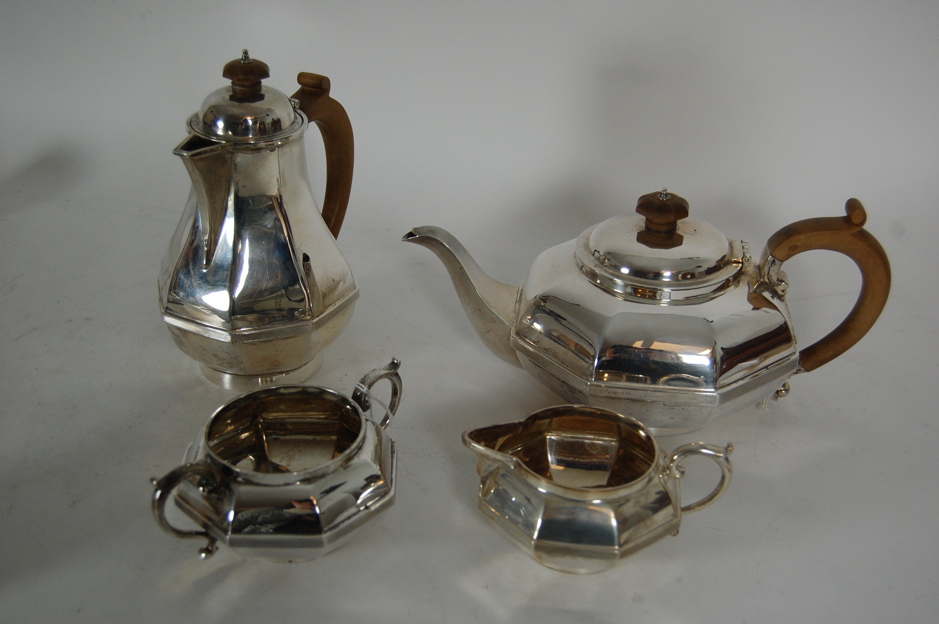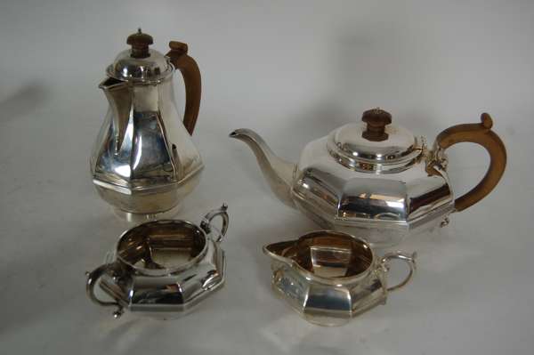 Edwards & sons of Glasgow, 1934, comprising water pot, teapot, cream jug and twin handled sugar bowl, each of panelled octagonal form with textured girdle and simple S scroll handles (4)