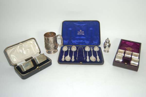 Birmingham with rubbed date letter, the simple can body with embossed display of flowerheads and scrolls, with simple C scroll handle; together with a cased pair of napkin rings, a cased set of five napkin rings, teaspoon and pepperette (qty)
