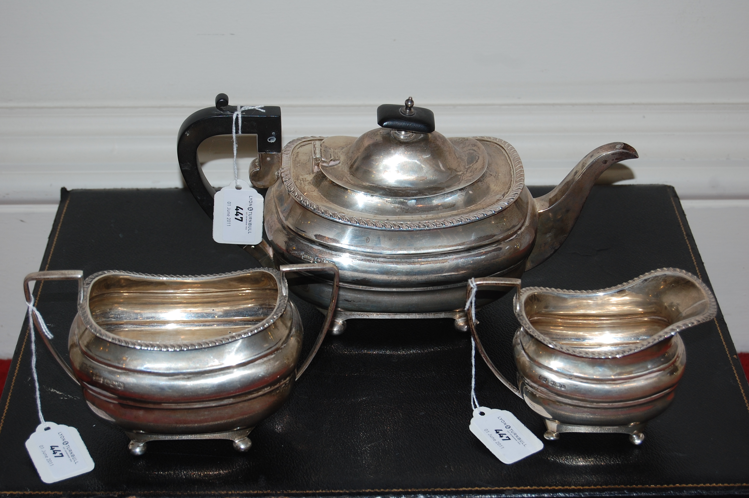 Walker & Hall, Sheffield 1925, comprising teapot, twin handled sugar bowl and milk jug with bellied bodies and gadrooned rims (3)