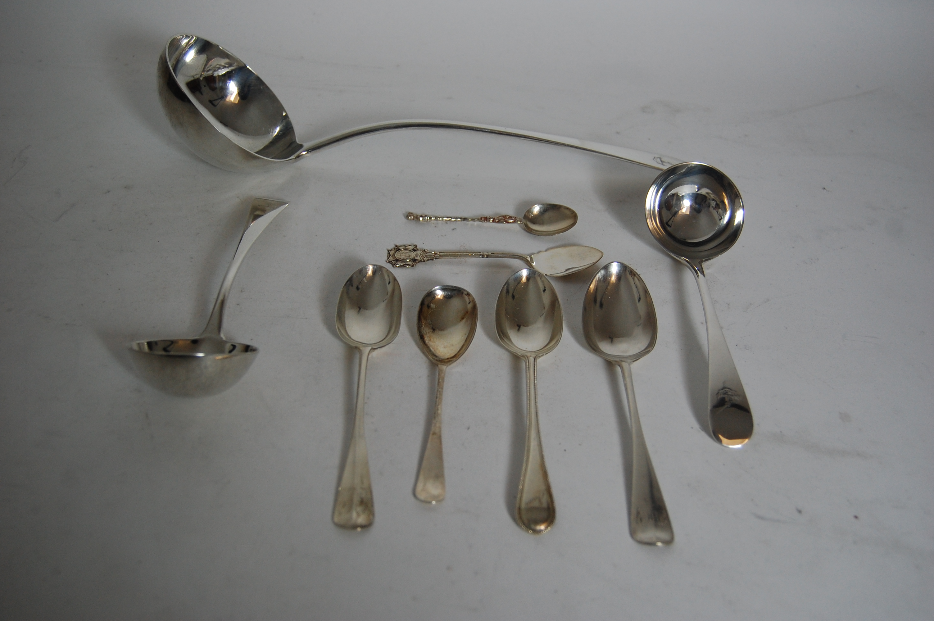 Goldsmiths & Silversmiths company, London 1920, of Hanoverian pattern with engraved crest to terminal, together with two matching sauce ladles and a small group of flatware (qty)