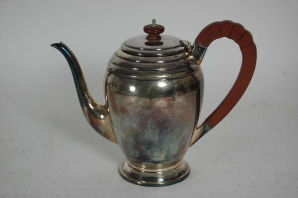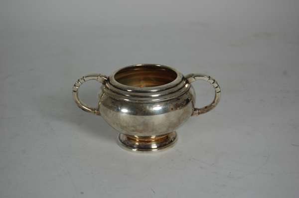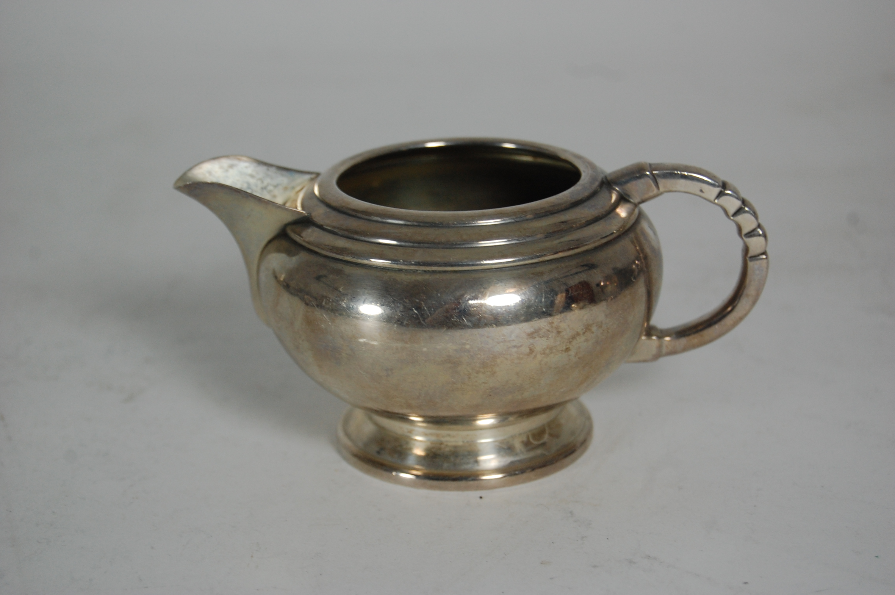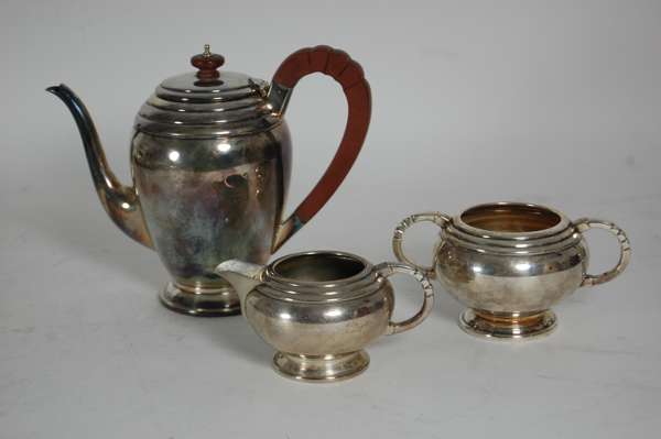 Birmingham 1921, comprising teapot, milk jug and twin handled sugar bowl, each with simple tapered bodies with bold fluted upper rims (3)