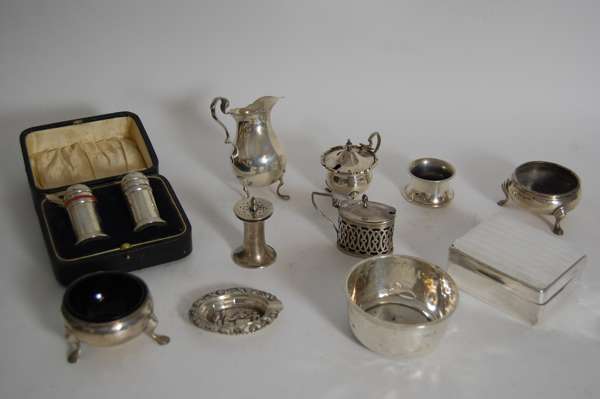 mainly of simple open form with moulded rims and hoof feet; a cased pair of peppers of cylindrical form with domed pierced covers; together with a cigarette box and a modern baluster cream jug (qty)