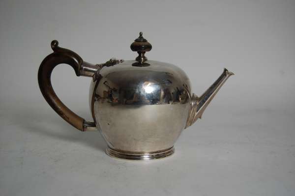 S Garrard, London 1913, the teapot of compressed bullet form with C scroll wooden handle, the sugar bowl of simple hemispherical from with reeded rim and foot (2)