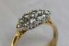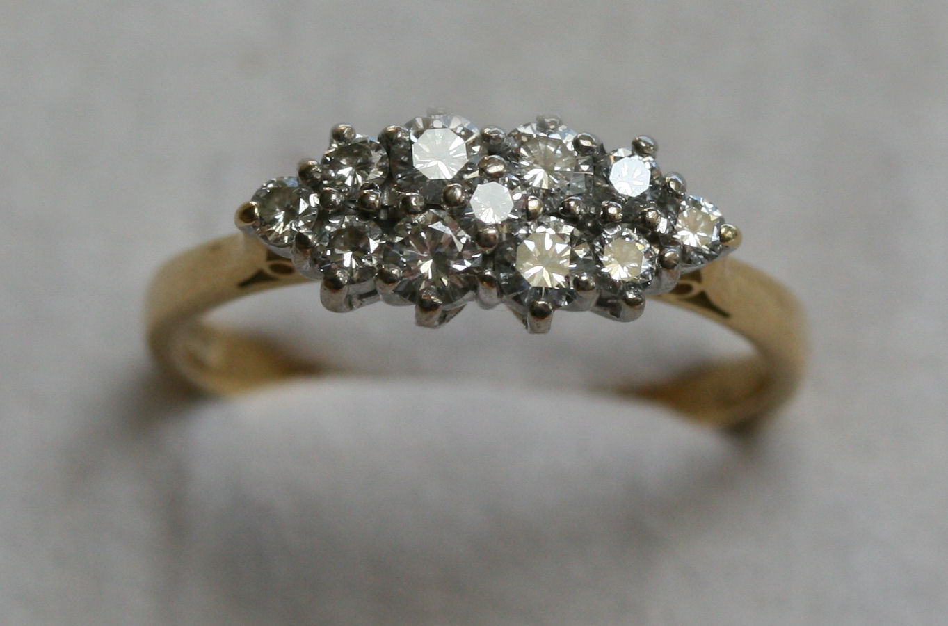 claw set in white gold with ten circular brilliant cut diamonds, basket setting, yellow gold shank