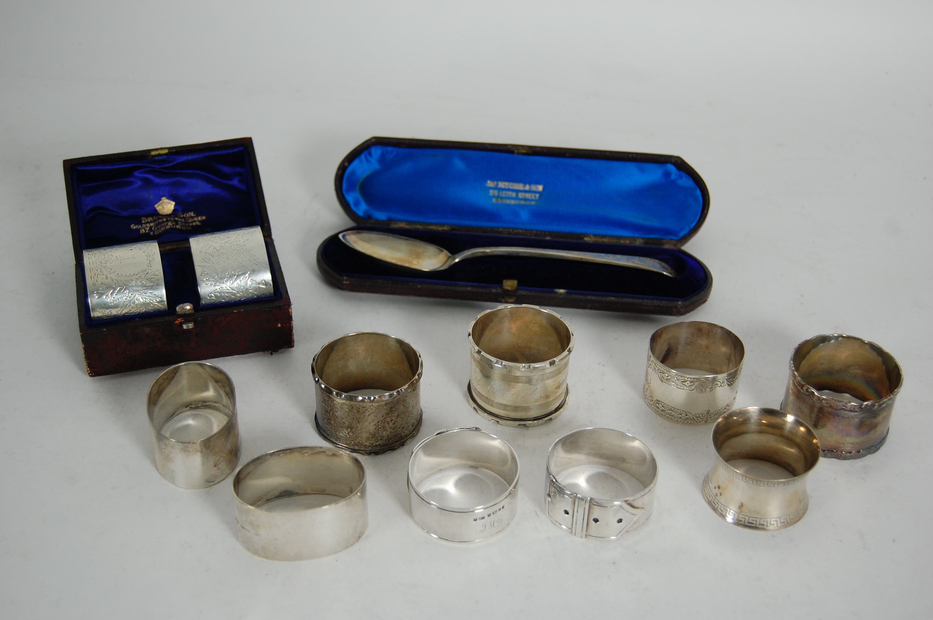 of simple form with engraved and moulded decorations; also to include an engraved cased spoon (qty)