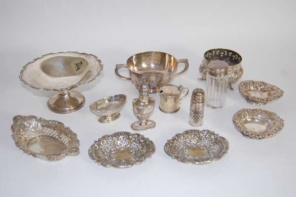 A group of silver dishes