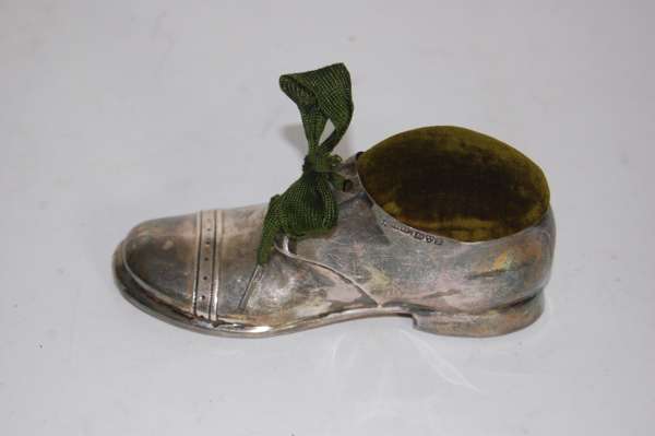 Chester 1909, formed as a shoe with engraved details, in original box inscribed to cover "The Dandy" pin cushion