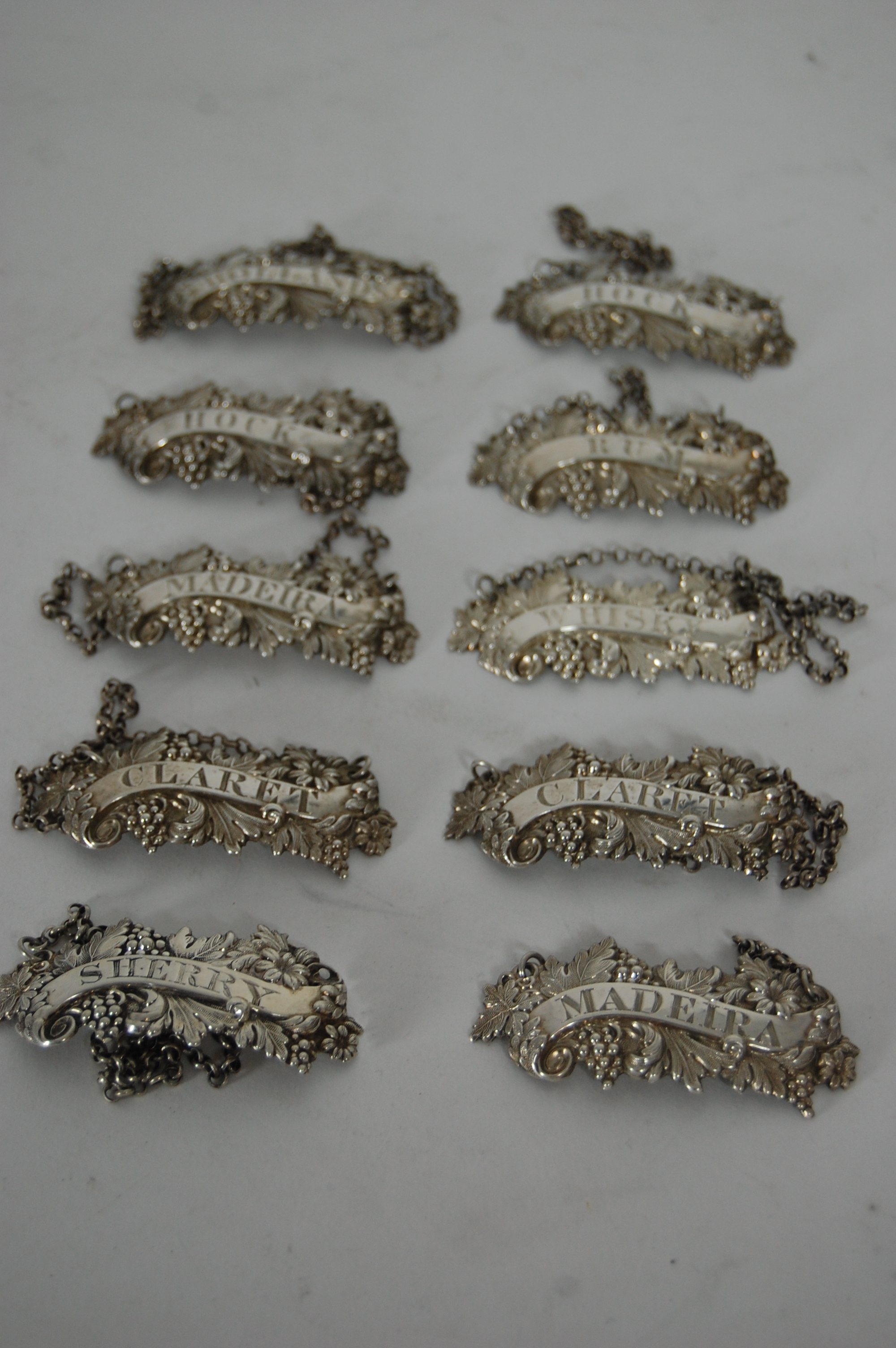 Taylor & Perry Birmingham 1827, 1835, 1836 and 1840, each with fruiting vine and inscribed within ribbon to centre, each inscribed for RUM, HOLLANDS, WHISKY, MADERIA (2), SHERRY, CLARET (2), HOCK (2), each suspended from a belcher link chain (10)