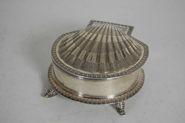 S Garrard, London 1901, the cover formed as a shell with chased details and ovolo border, with straight sides and similar lower border raised on four snail formed feet, the interior with simple cover to inkwell engraved 'Barrow 1901'