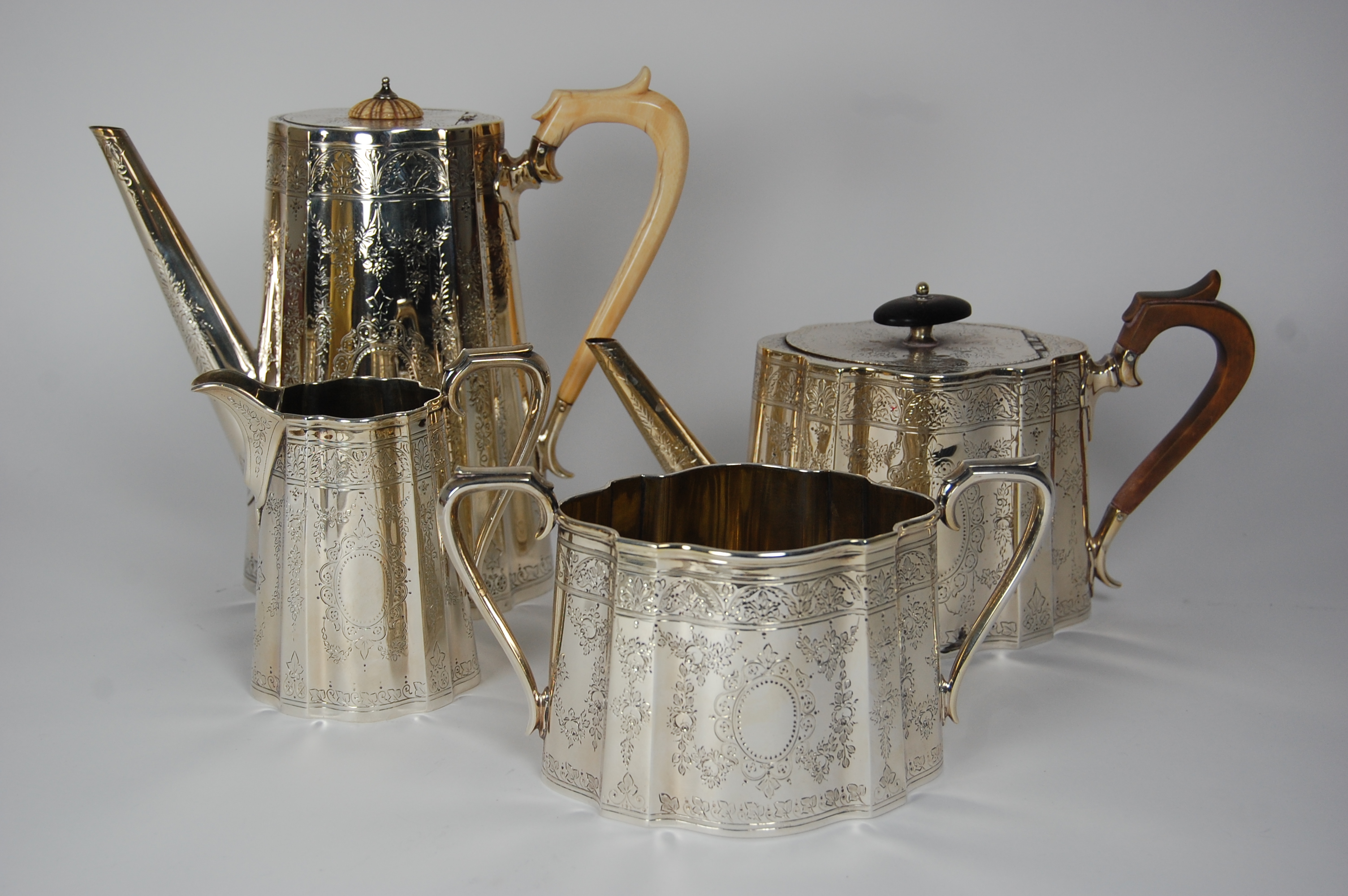 retailed by Widdowson & Veale, London 1872, comprising coffee pot, teapot, twin handled sugar bowl, and milk jug, each of straight sided panelled form with profusely engraved foliate borders and panels, the coffee and tea pots with long straight spouts (4)