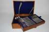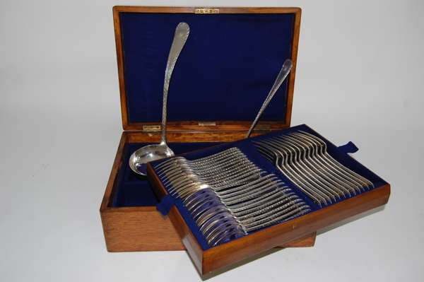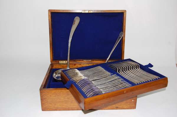 T Smith & Sons, Glasgow 1899, of Old English pattern with bright cut borders and engraved initial M to terminal, comprising twelve each of : Table forks tablespoons dessert forks dessert spoons gravy spoon soup ladle sauce ladle contained in oak canteen with lift out tray