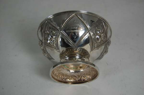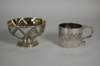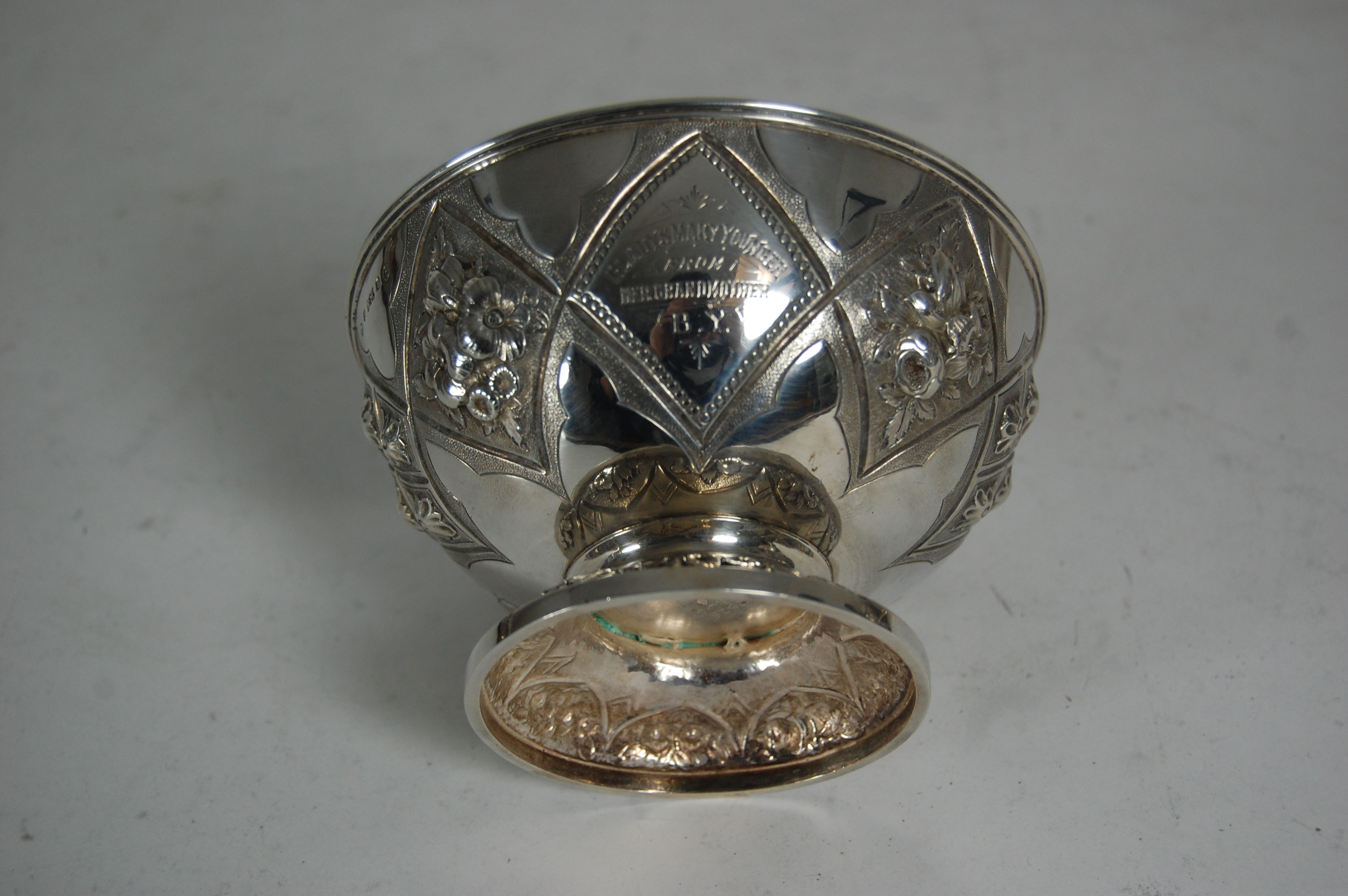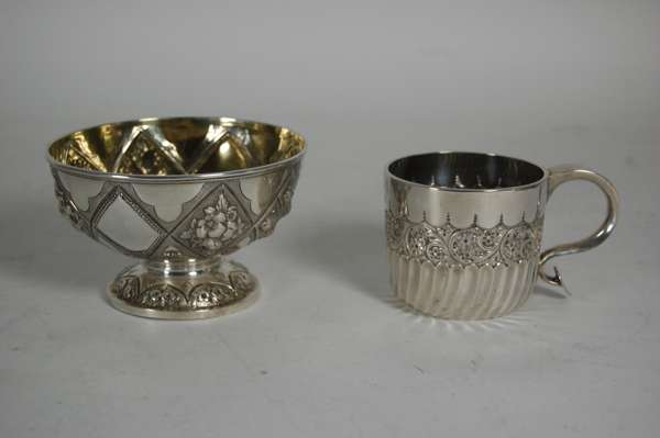 E Milledge, Edinburgh 1870, the hemispherical bowl with embossed and chased panels of alternating flowerheads and lozenge details, on domed foot with chased border; together with a christening mug, with semi spiralled fluting and foliate scrolling band (2)