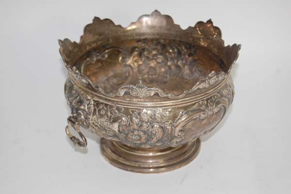 C S Harris, London 1902, the baluster bowl with embossed floral borders and scalloped rim, with C scroll formed vacant cartouches and twin hinged lion mask handles