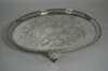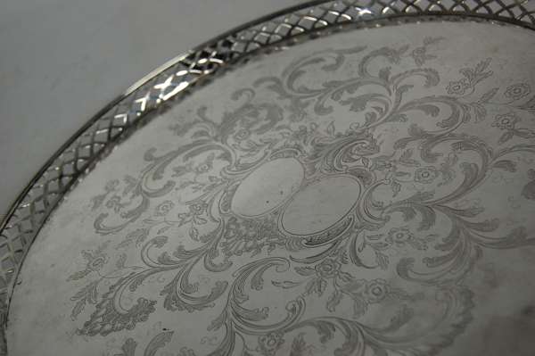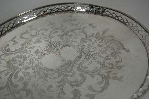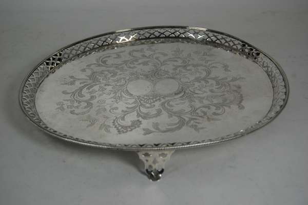 Hayne & Carter, London 1766, of circular outline with everted lattice work pierced border, the centre with foliate scroll engraved decoration surrounding twin oval vacant cartouches, the whole raised on three pierced bracket feet