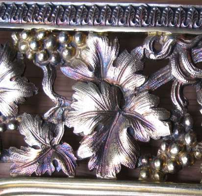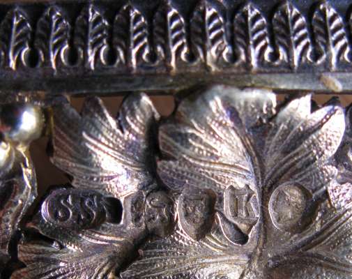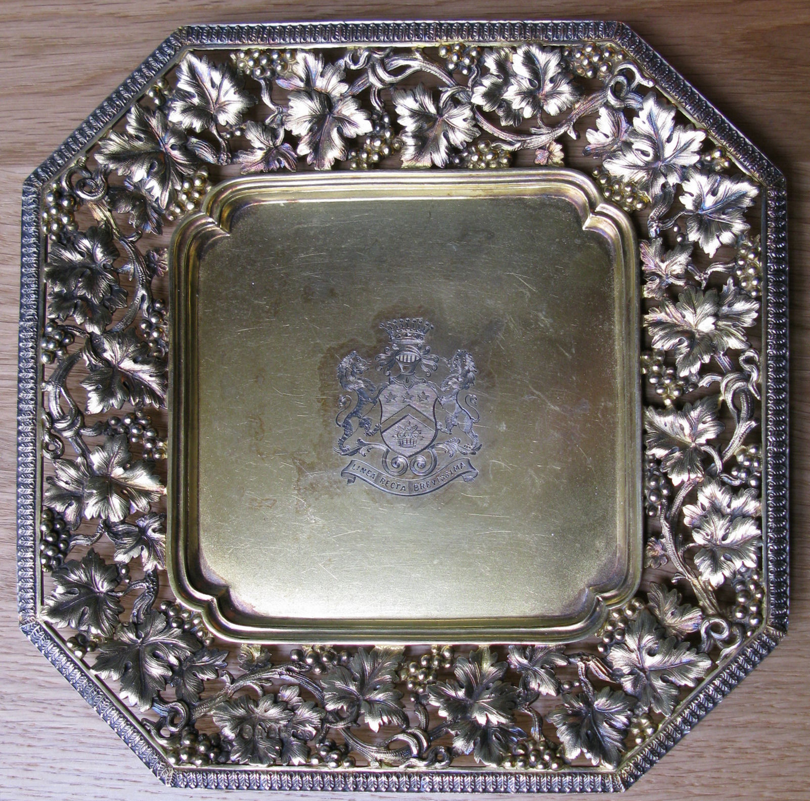 maker's mark S.S, London 1885, of canted square form centred by an engraved armorial crest, within an ornate cast openwork fruiting vine chased border