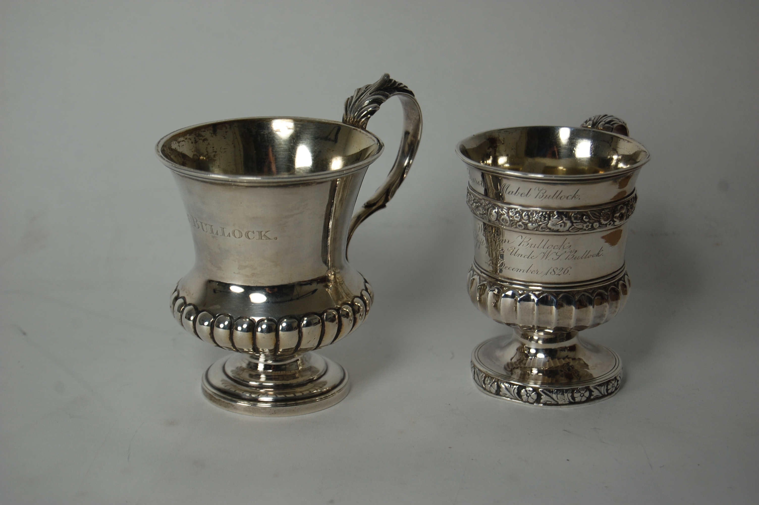 WB, London 1792, of campana form with gadrooned lower section above waisted stem and stepped foot, with leaf capped scroll handle and body engraved 'EDWIN BULLOCK'; together with a similar example London 1798, with fluted lower section and band of trailing fruit and foliage (2)