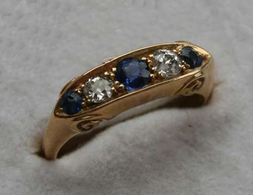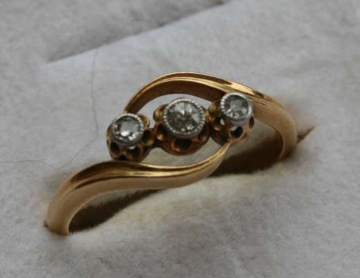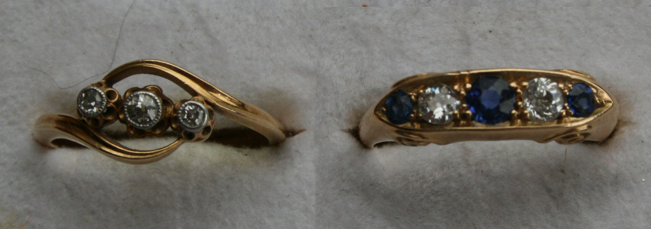 the graduated stones set in a tapering gallery, scroll details, 18ct gold shank and a small three stone diamond ring