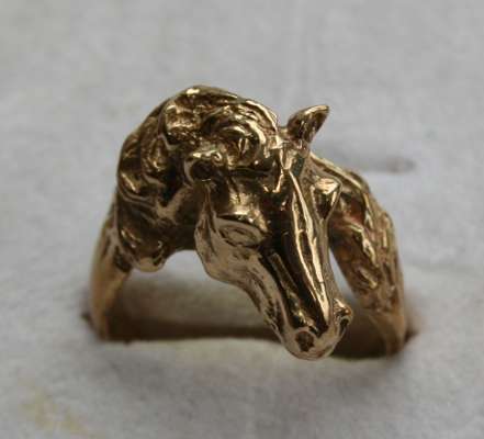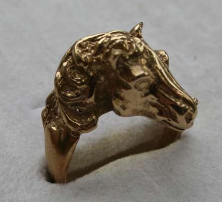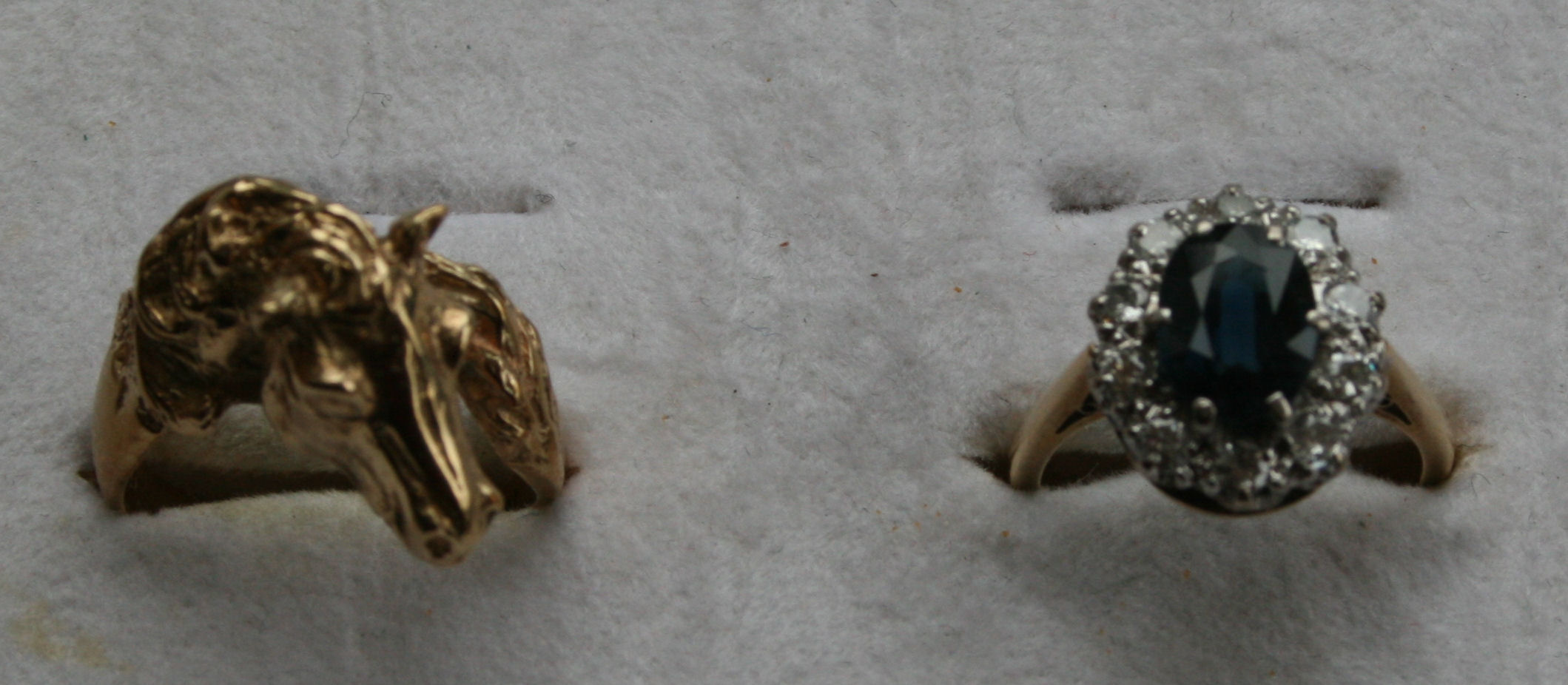the central oval sapphire with a border of circular cut diamonds set in platinum, 18ct gold shank, together with a 9ct gold ring cast as a horse's head and tail (2)