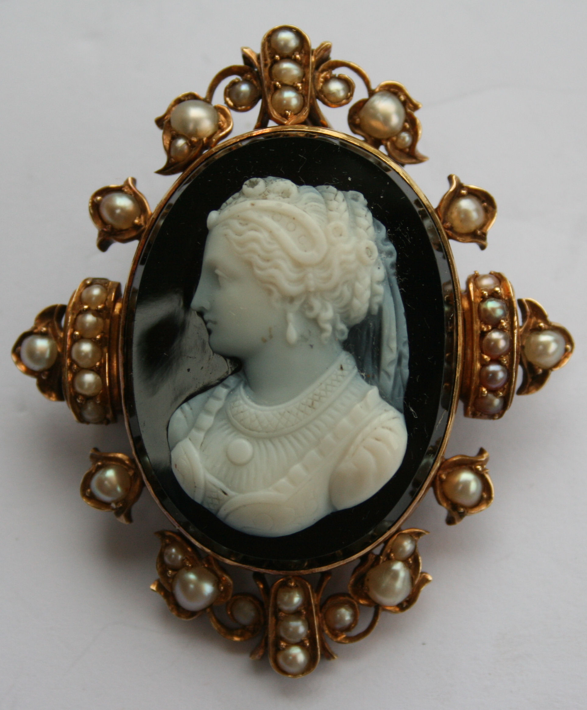 the oval cameo of a lady wearing bejewelled hair and all within an oval gold frame set half pearls