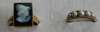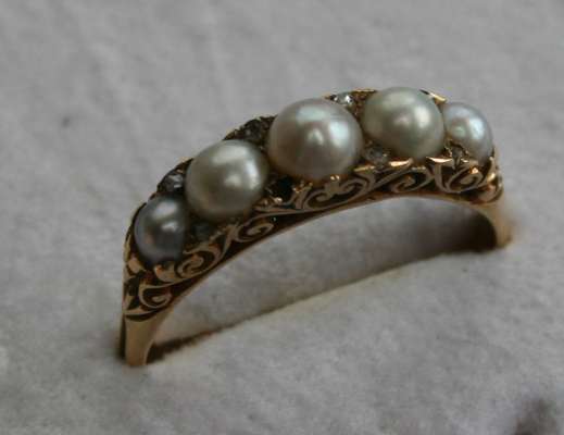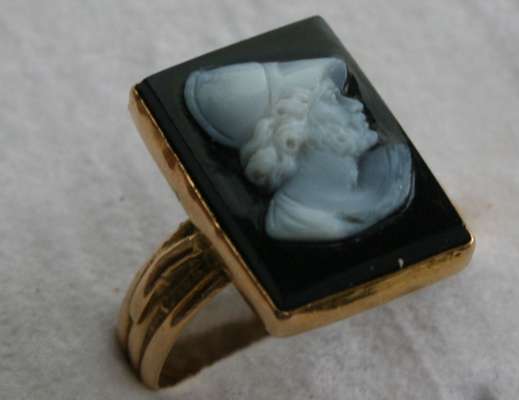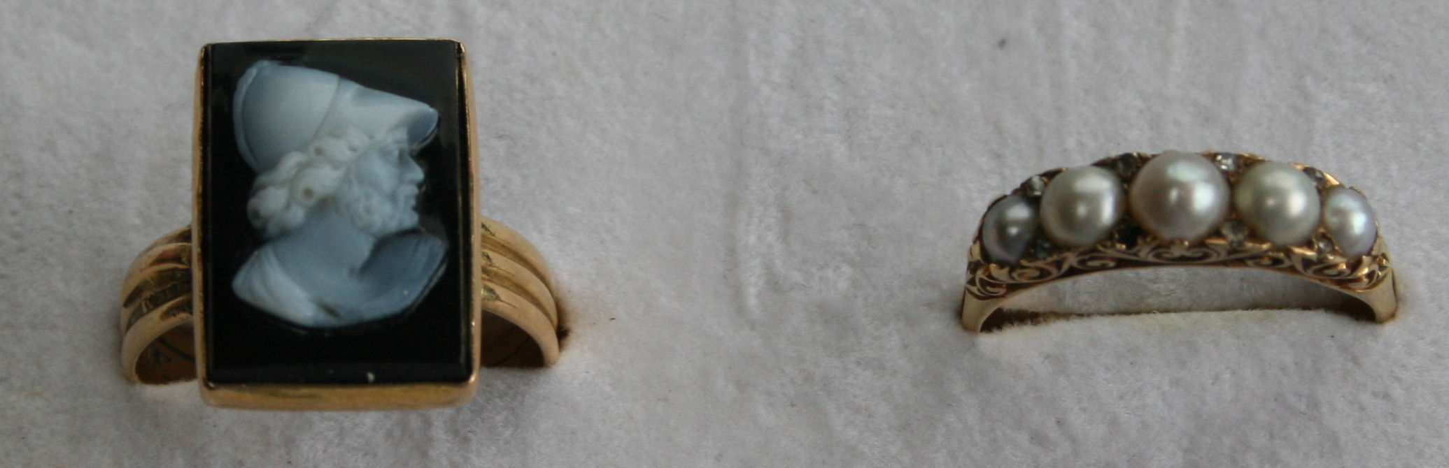 the graduated half pearls claw set with diamond chips in between, scrolling gallery; together with an 18ct gold ring with a rectangular hardstone cameo ring decorated with a helmeted man (2)