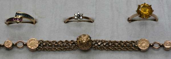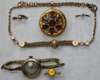 with a gilt sprung flexible strap; a 9ct gold neck chain made up from lady's watch chain and part muff chain; a small sapphire and diamond ring set in 18ct gold; a citrine set ring; a small diamond and sapphire cluster ring and an attractive Victorian gold and gem set brooch/pendant of circular form