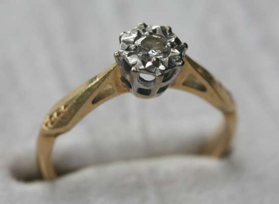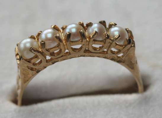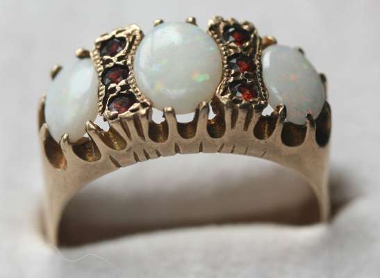 a five stone pearl ring; a small diamnond cluster ring; a solitaire diamond ring; an opal and garnet ring (4)