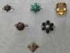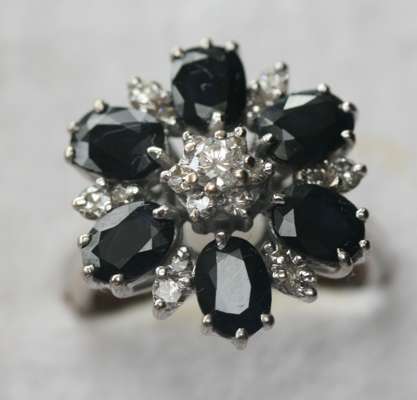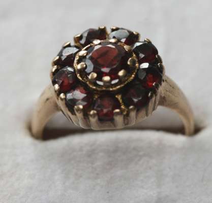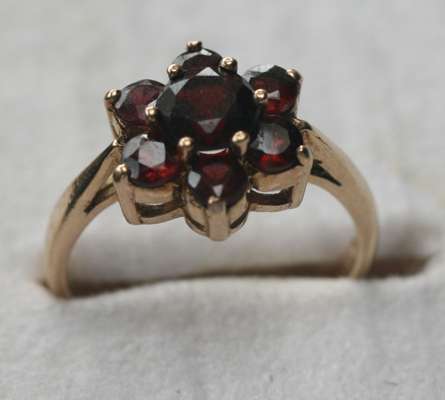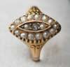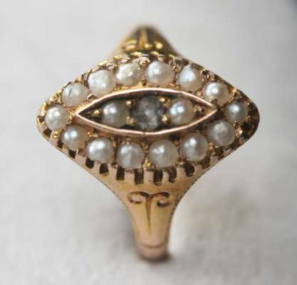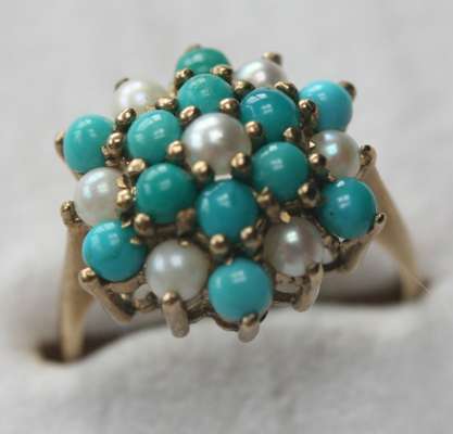 a garnet cluster ring; a pearl and turquoise set ring; a large citrine ring; a garnet cluster ring; a 1970's diamond and sapphire cluster ring, a late 19th century pearl and diamond ring of navette shape (6)