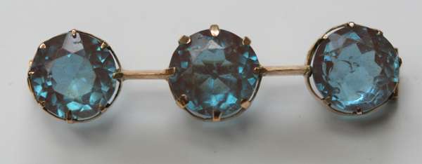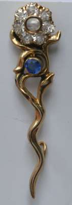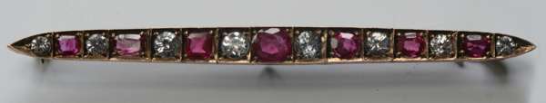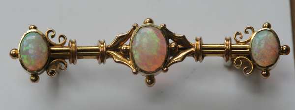an Edwardian gold bar brooch with three graduated opals, clasped in leaf shape motif, split detail to the bar; a gold long bar brooch set paste diamonds and rubies; a gold brooch set three simulated alexandrites; a gold brooch modelled as a spray of ferns with small pearls; a sapphire and gem set brooch modelled as a flower. (5)