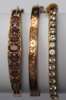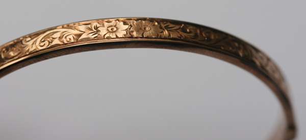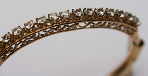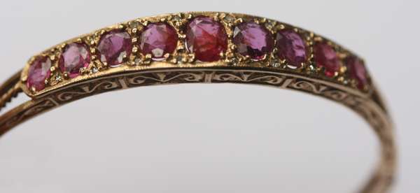 the first of tubular form, marked 14K and set single row of claw set white pastes, attractively pierced gallery; a Victorian hinged bangle with all over chased decoration and set with a row of rubies and diamond chips in between; a 9ct gold hinged bangle engraved decoration (3)
