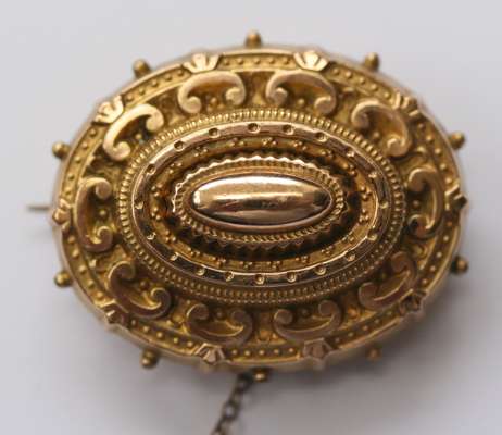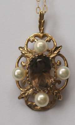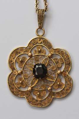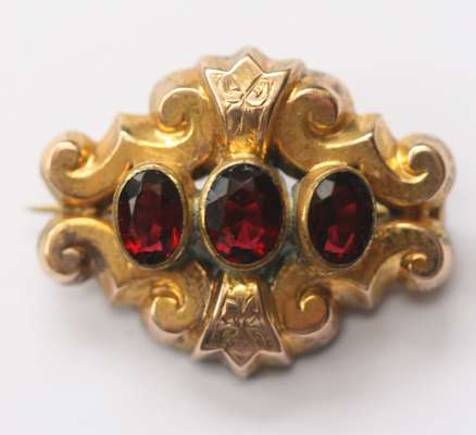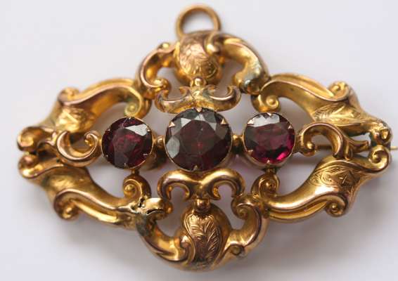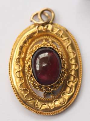two scrolling brooches set garnets and red pastes; gold filligree and garnet set pendant with a gold neck chain; a gold pendant set Argentinian gold coin; an oval gold brooch with cannatille decoration and scroll detail; a paste set locket; a gold anchor brooch; a pearl and quartz pendant with fine link chain and aquamarine set brooch; an oval gold pendant with cabochon garnet and a pair of garnet set earrings (12)