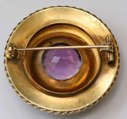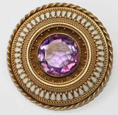 the circular cut amethyst within a cannatille border and outer border with white enamel ground, rope twist border