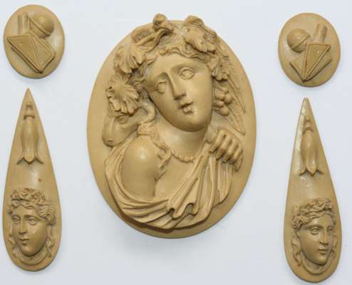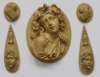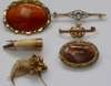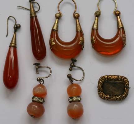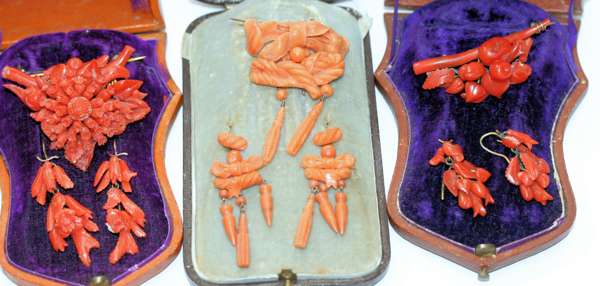 three Victorian coral demi-parures, comprising brooch and ear drops; a group of unmounted lava cameos to make a brooch and a pair of ear drops; a group of gem set and regimental brooches; ivory beads; various agate ear drops etc