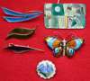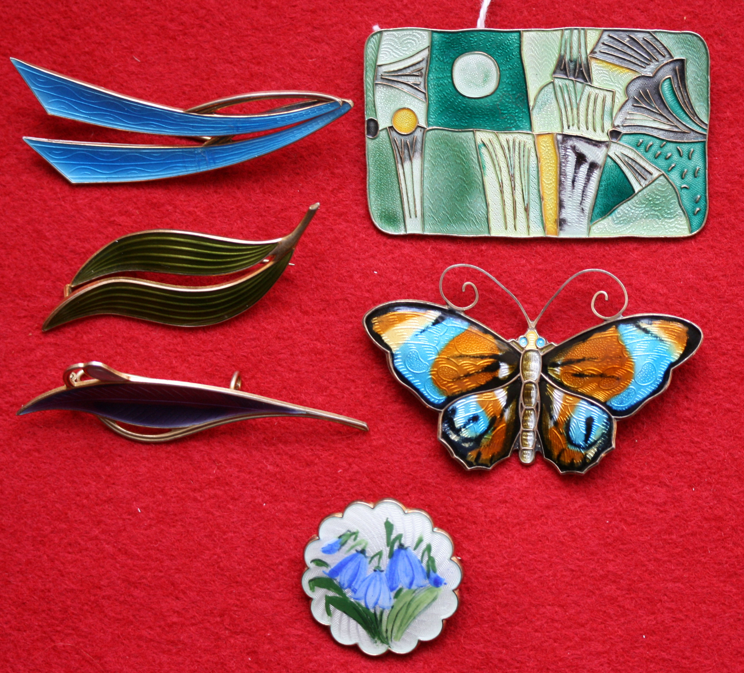 of rectangular form, with abstarct design in greens and yellow, together with another as a butterfly; OSVAIS, Norway, a modernist brooch in purple; two others similar, unsigned; another enamel brooch of lobed circular form decortaed with bluebells(6)