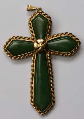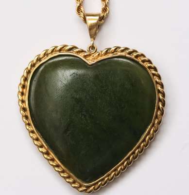 probably nephrite, the first modelled as a cross, heavy rope twist border, the other pendant of heart shape, similar rope twist border, with a rope twist long neck chain