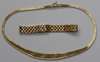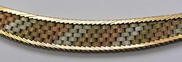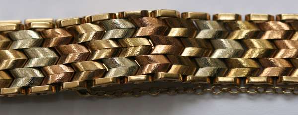 the necklace of herring bone links tapering out to a brick effect fringe, with a satin and polished link bracelet similar three colour gold