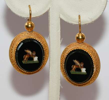 each set with St. Marks lion, the symbol of Venice, simple cannatille decorated gold mounts, the earrings with wire hoops
